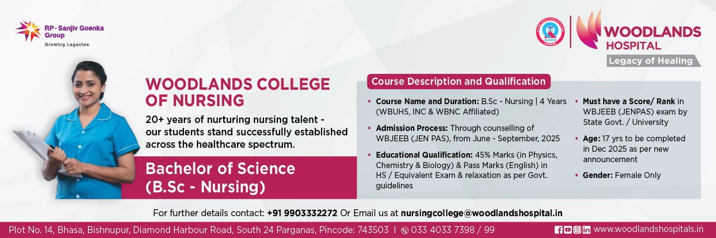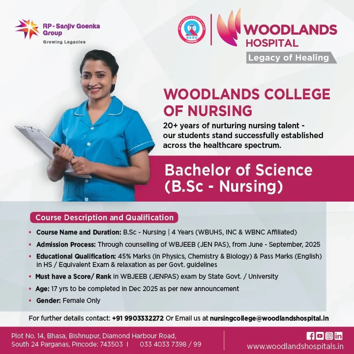 Woodlands College of Nursing invites applications for the course: Bachelor of Science (B.Sc - Nursing) For queries / to apply, Phone : 9903332272 Email : nursingcollege@woodlandshospital.in / wscn@woodlandshospital.in