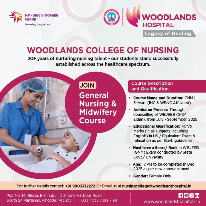 Woodlands College of Nursing invites applications for the course: General Nursing & Midwifery (GNM) For queries / to apply, Phone : 9903332272 Email : nursingcollege@woodlandshospital.in / wscn@woodlandshospital.in